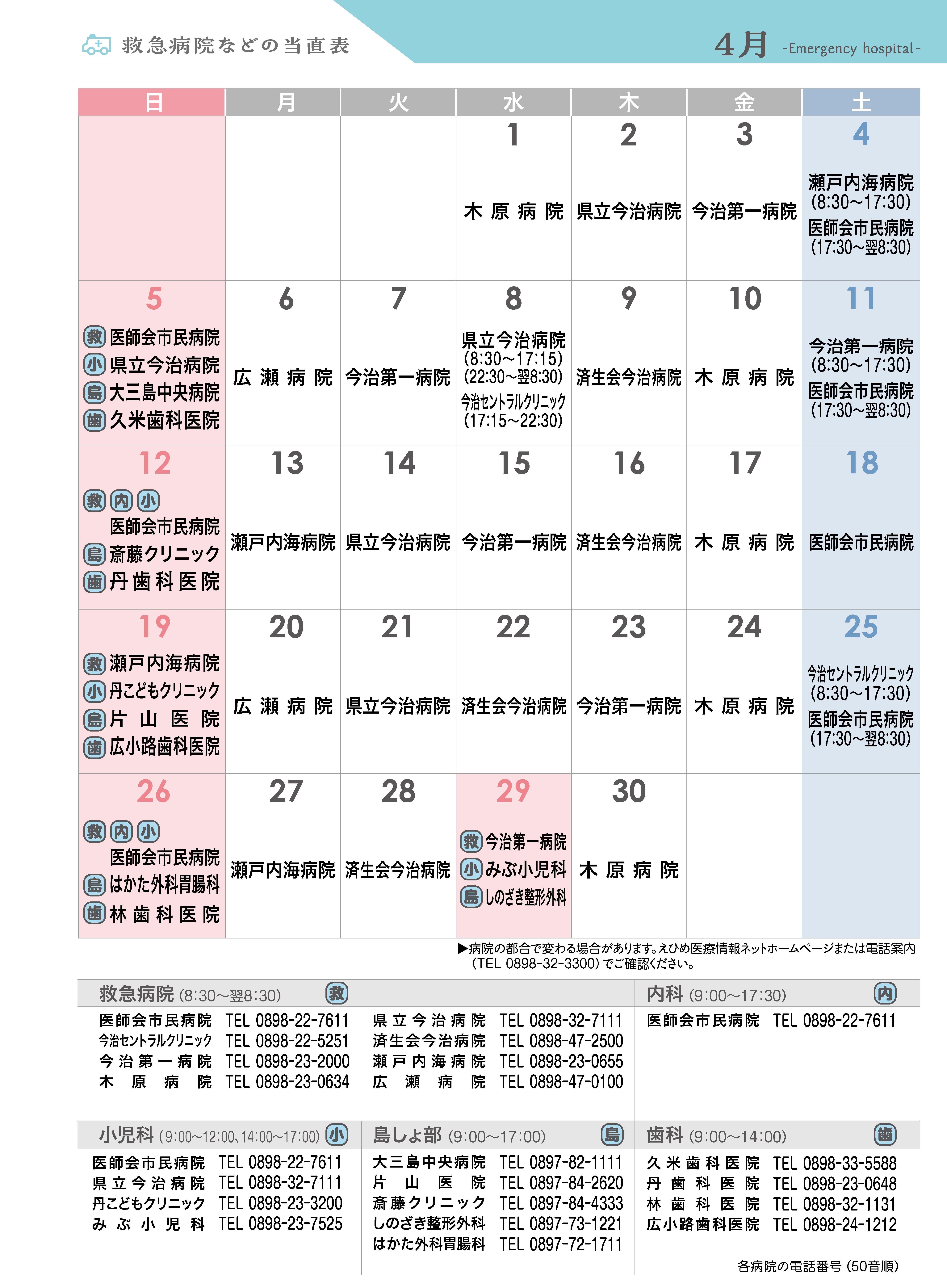 病院の都合で変わる場合があります。えひめ医療情報ネットホームページまたは電話案内(【電話】0898-32-3300)でご確認ください。