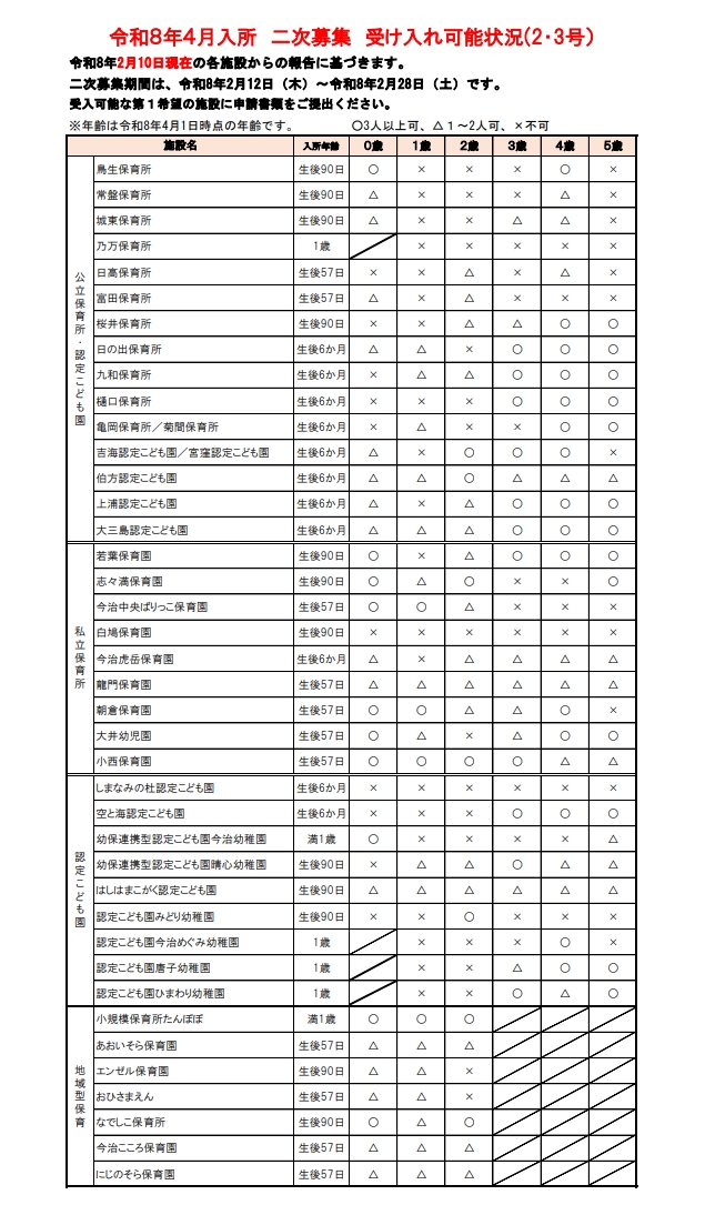 今治市内の保育所、認定こども園(保育所部分)、地域型保育事業所の令和8年4月入所の受入可能状況(二次募集)をお知らせします。